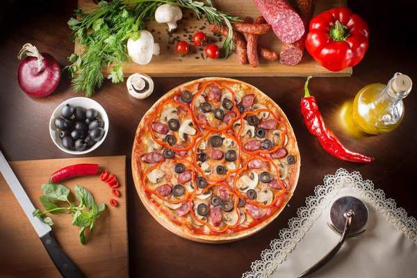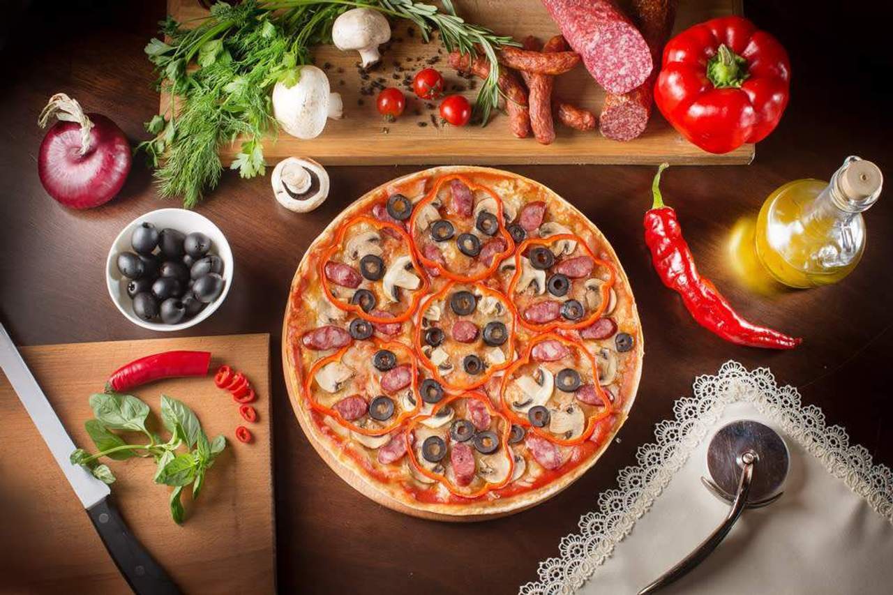 Sos de roșii, mozzarella, prosciutto cotto, bacon, salam dulce, cârnați, ciuperci proaspete, ceapă, măsline - 560g