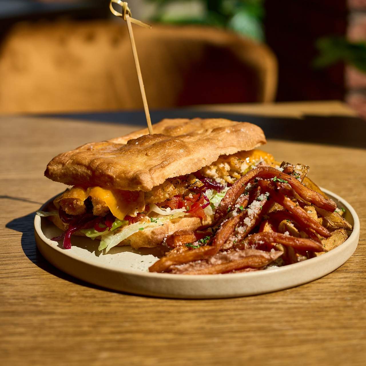 Mușchi de vită, focaccia, unt, sos chimichurri ( pătrunjel, coriandru, șalotă, usturoi, ardei iute, oregano, ulei de măsline, zeamă de lămâie, sare), ceapă roșie, roșii, busuioc, sare, piper, cașcaval cheddar, cartofi albi - 350g