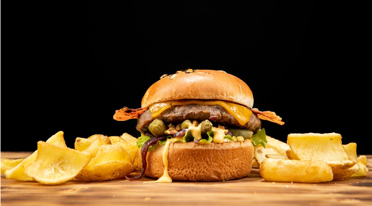 Chifla artizanala cu cartofi,Carne vita Black Angus,cheddar,ceapa ,castraveti murati ,ketchup ,mustar -cartofi prajiti