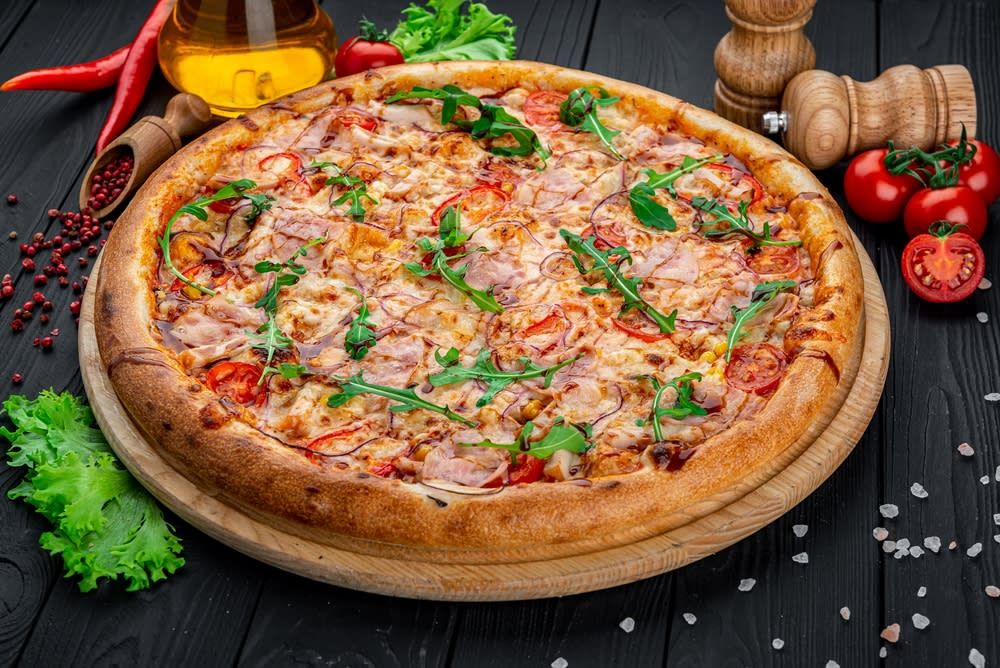 Sos roşii, aluat pizza, mozzarella, oregano, piept de pui, porumb, ardei - 450g