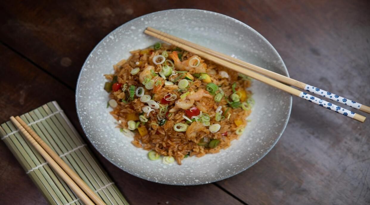 Creveti cu orez jasmine cu ceapa, ardei in 3 culori si zucchini si sosuri asiatice - 350g