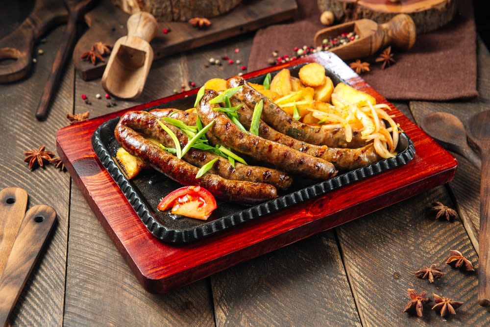 Cârnați la grătar 200g + cartofi pai 200g + mustar 40g