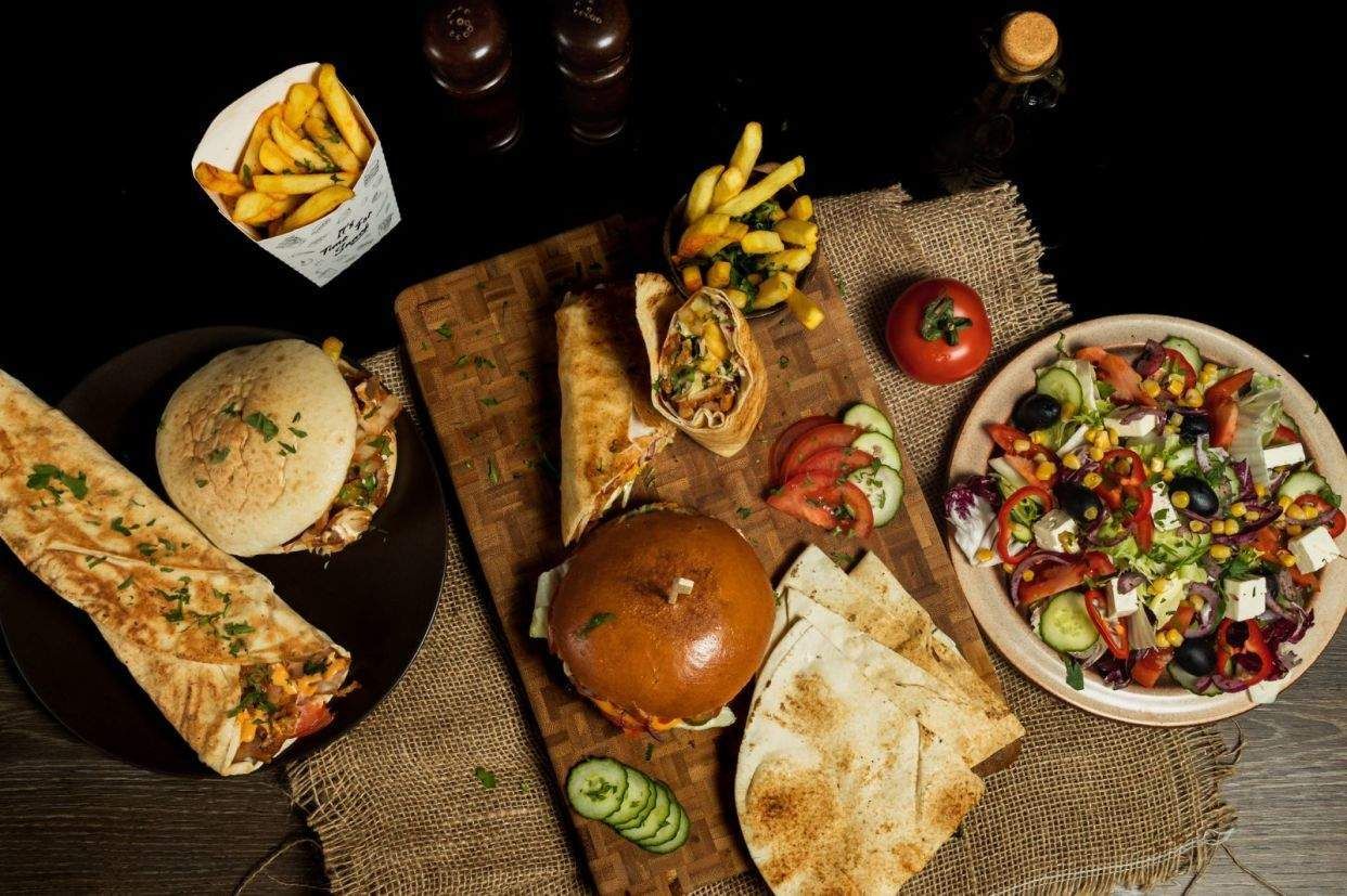 INGREDIENTE : Pită pe vatră, crispy, cartofi pai de casă condimentati, roșii felii, castravete murat/castravete verde, salată de varză cu morcov si patrunjel, ceapă roșie cu sumac și patrunjel, sosuri .350 g-400 g