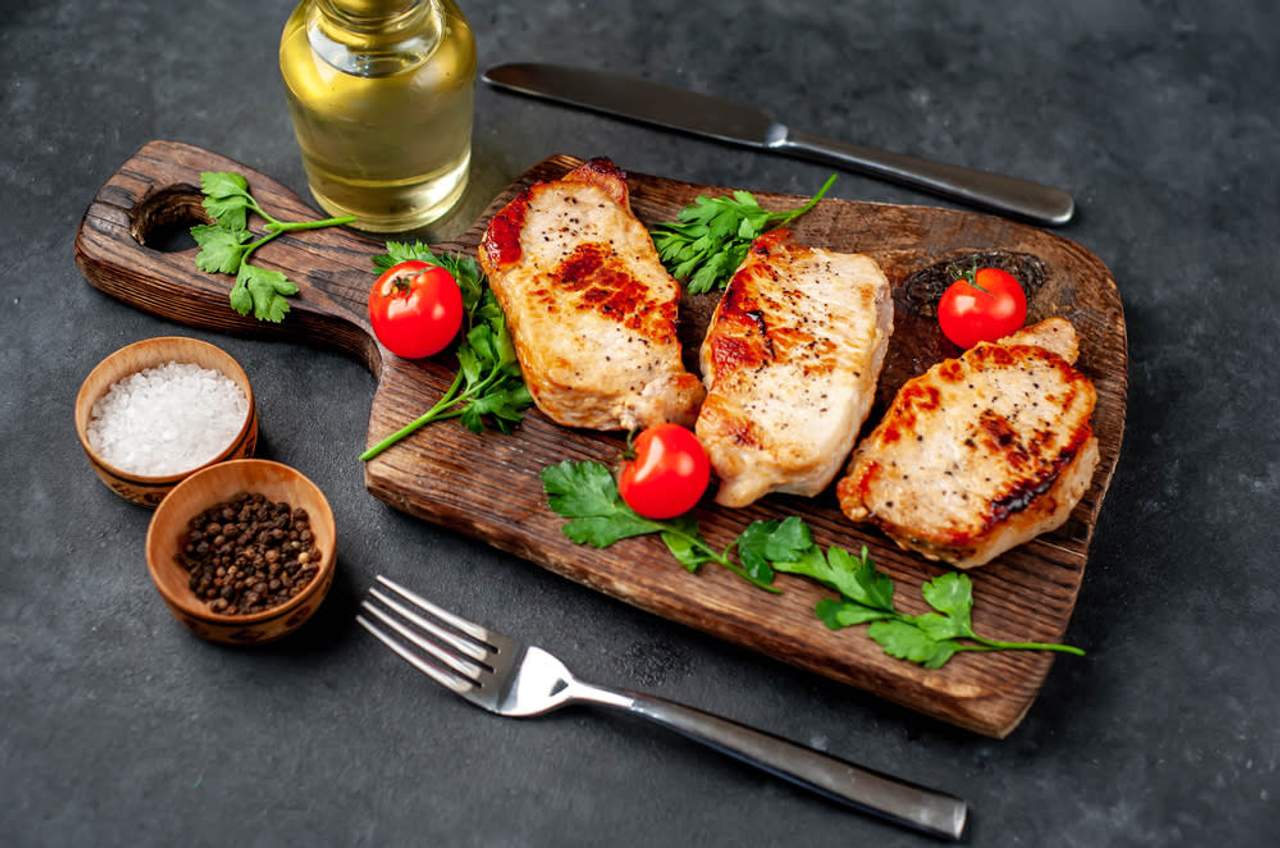 Platou coaste porc marinate la cuptor cu cartofi fripti si muraturi