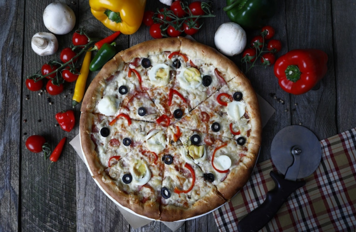 Blat pizza, sos pizza, cascaval, sunca pui, ciuperci, rosii, masline - 1.35kg