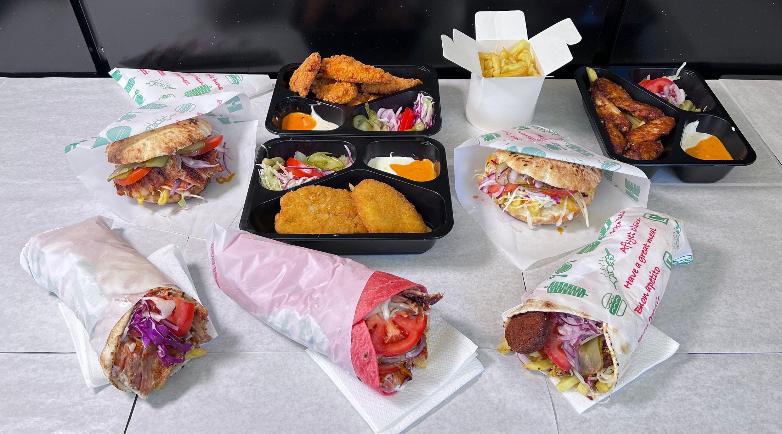 Lipie, carne pui / porc / mixt, cartofi, rosii, castraveti murati, ceapa, varza, ardei iute, sos maioneza cu usturoi, sos ketchup, sos tzatziki, sos sambal, sos doner, sos antep, sos Tartar - 610g