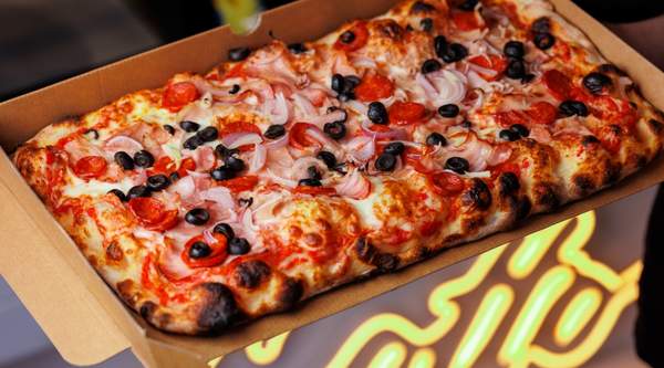 Aluat, sos de rosii, mozzarela, salam picant, ardei copt, măsline kalamata, brânză feta - 1.09kg