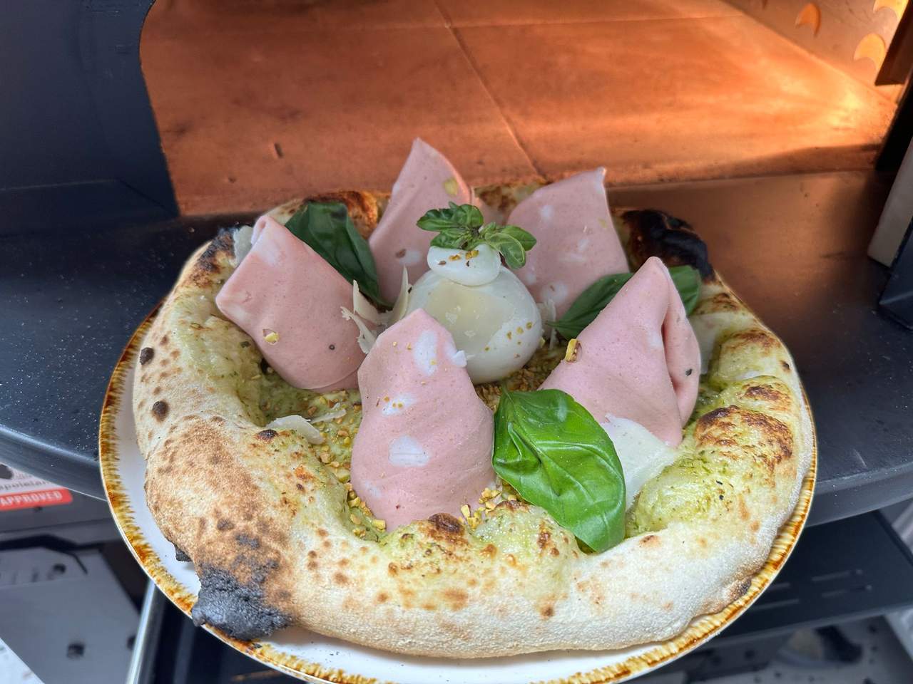 Blat napoletan, mozzarella fior di latte, pesto de busuioc home made, mortadella, burrata, fistic, grana padano, busuioc