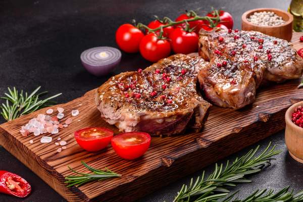 Muschi de vita argentinian, cartofi proaspeti aromatizati, sparanghel, pepperoncino, roșii chery, mix salata, praz, smântână gatit, sos hribi de padure - 480g