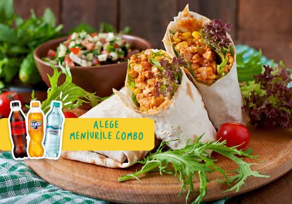 Carne LA alegere, lipie, nachos chips, orez, salata iceberg, ceapa crocanta, mozzarella, smantana, sos curry