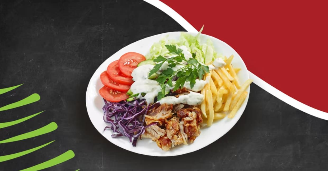 Carne rotisată, varză, salată, roșii, castraveți, ceapă, sos - 300g