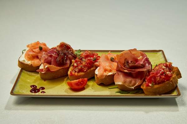 Bruschetă cu somon 1 buc, bruschetă cu roșii 2 buc, bruschetă cu prosciutto 2 buc - 350g