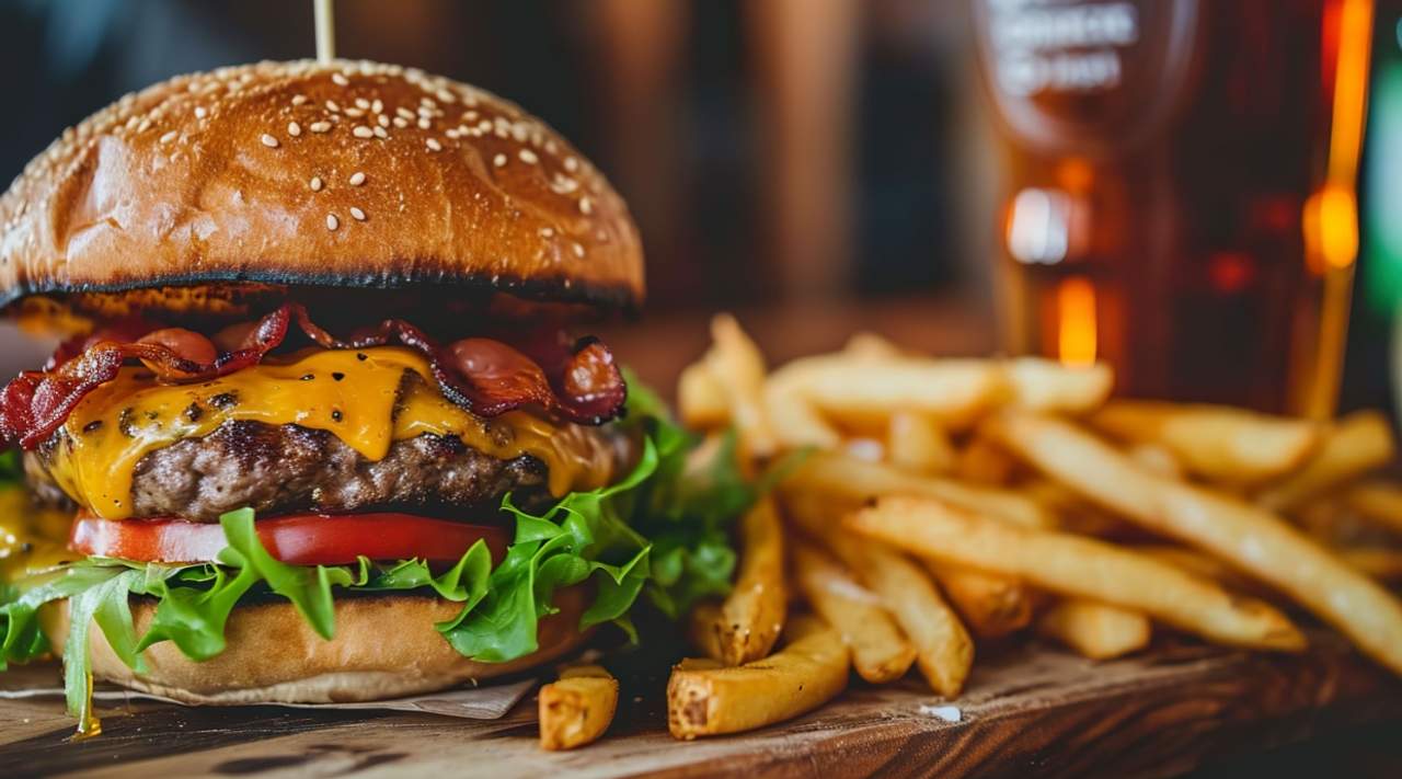 Chiflă brioșă , vită maturată 150gr, cheddar felii , ceapă caramelizata , bacon , sos cheddar ,+150gr cartofi
