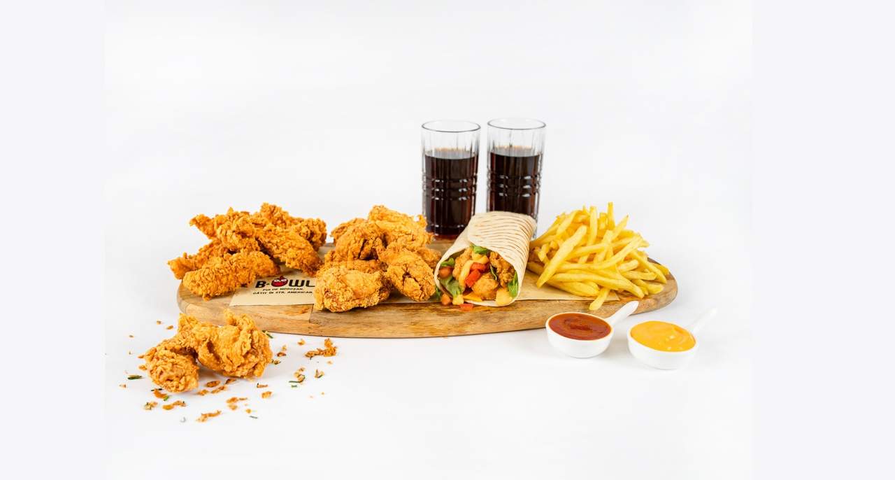1 tortilla-wrap picanta/nepicanta 200g, 10 aripioare picante/nepicante 400g, 5 crispy strips picanti/nepicanti 225g, 2 portii de cartofi prajiti 300g, 2 bauturi racoritoare si 2 sosuri la alegere