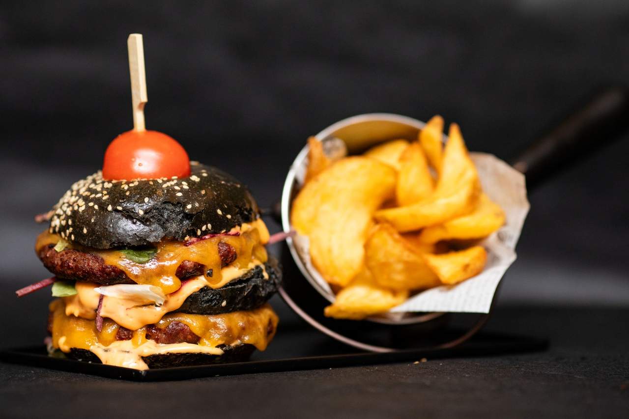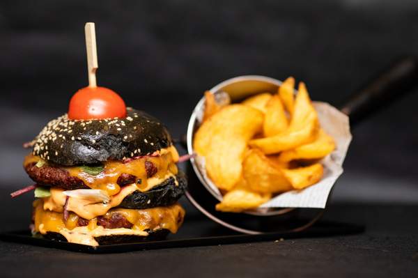 Chifla neagră, carne de vită, brânză cheddar, salată, ceapă caramelizată, sos burger, cartofi prăjiți - 600g