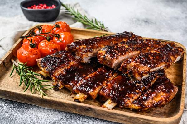 Coaste porc la cuptor,cartofi rumeniti cu usturoi,sos maioneza si sos bbq -650g