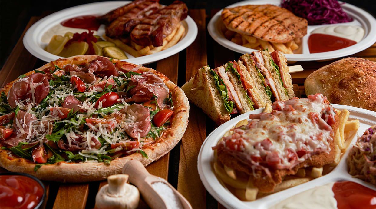 3 buc. cașcaval pane, garnitură la alegere, salată coleslaw, 2 sosuri la alegere, chifla pe vatra 530g