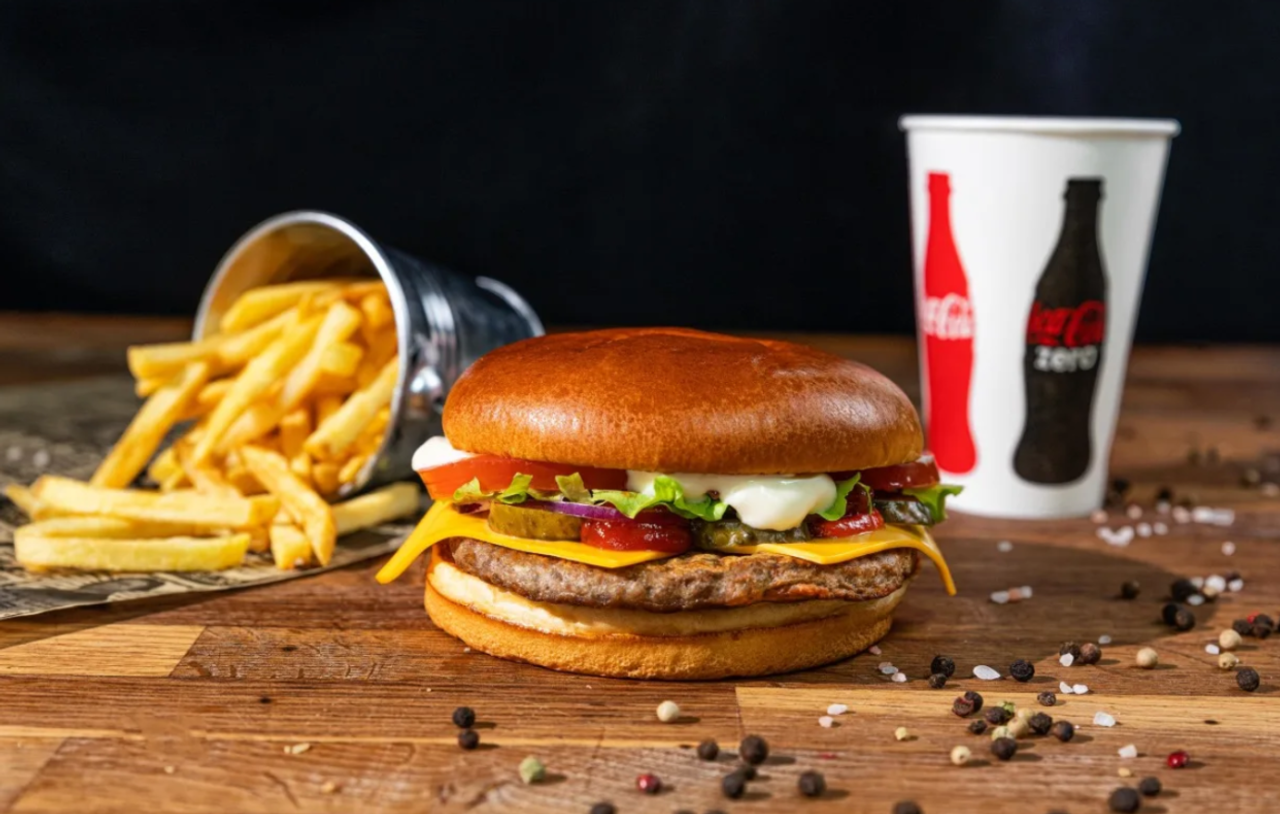 Dublu Chees (2 felii de carne de vită preparată pe grătar, 2 felii debrânză cheddar, muștar, ketchup, ceapă, castraveți murați si chiflă - 165 gr.), cartofi prajiti (110/130 gr.), răcoritoare (330/500 ml.)