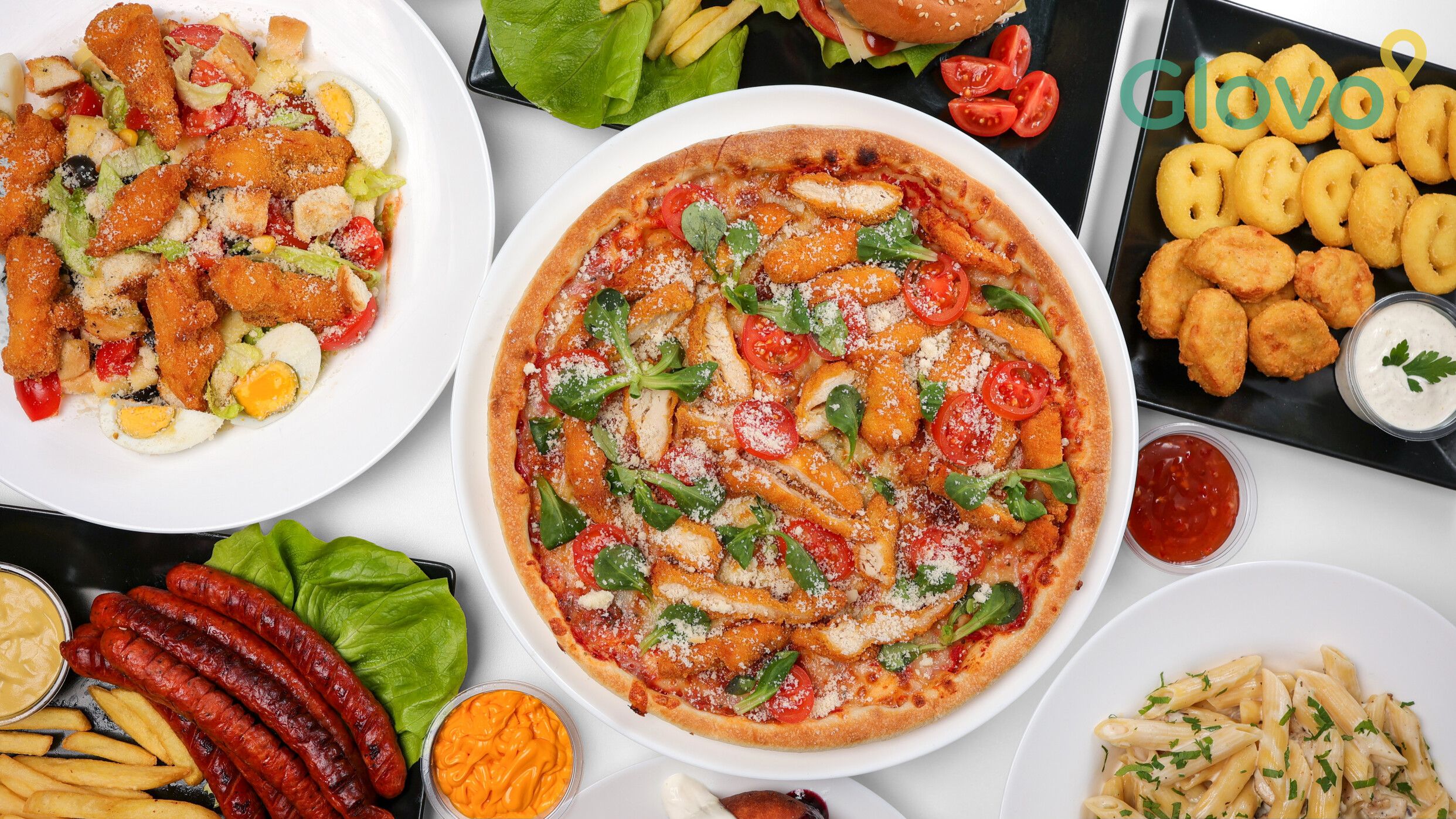 Ingrediente: sos pizza, mozzarella, sunca, ananas, porumb (1575gr) + 1 sos rosii dulce + 1 sos de rosii picant