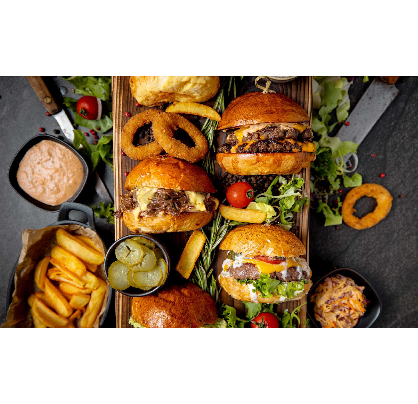 Chiflă burger, carne de vită black angus, sos cheddar cu jalapeno, bacon, salată, roșii, castraveți murați, ceapă caramelizată, sos Buzz, inele de ceapă, cartofi dippers, sos american, salată coleslaw