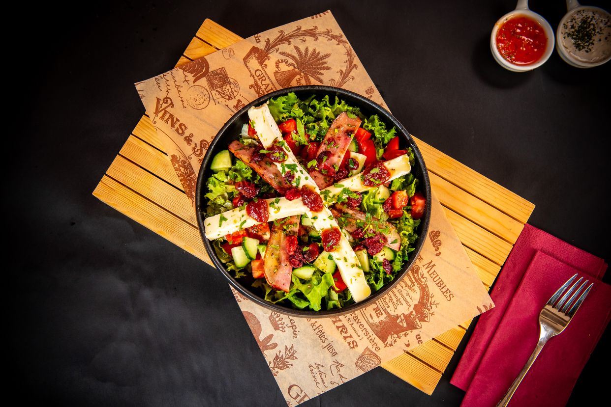 salată verde 50 g, piept de pui 50 g, bacon 30 g, roșii 100 g, ciuperci 30 g, ou fiert 50 g, sos de muștar franțuzesc cu cremă de gătit 100 g, crutoane cu verdeață zöld saláta 50 g, csirkemell 50 g, császárszalonna 30 g, paradicsom 100 g, gomba 40 g, főtt tojás 50 g, francia mustáros öntet főzőkrémmel 100 g, zöldfűszeres kruton Ingrediente: salată verde 50 g, piept de pui 50 g, bacon 30 g, roșii 100 g, ciuperci 30 g, ou fiert 50 g, sos de muștar franțuzesc cu cremă de gătit 100 g, crutoane cu verdeață Valori nutritionale (exprimate la 100g): KJ: 2154.4, Kcal: 514.65, Grasimi: 32.59, Acizi grasi saturati: 19.17, Glucide: 25.98, Zaharuri: 7.51, Proteine: 29.105, Sare: 1.71 Alergeni: Cereale care contin gluten (grau, secara, orz, ovaz, grau spelt, grau mare sau hibrizi ai acestora) si produse derivate, Oua si produse derivate, Lapte si produse derivate (inclusiv lactoza), Mustar si produse derivate
