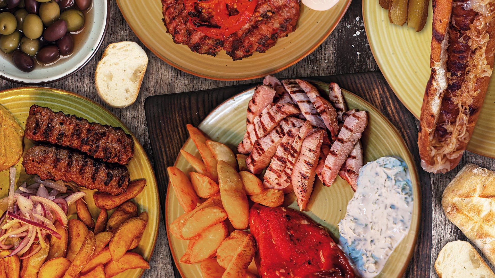Pljeskavica simplă, pljeskavica plus, cârnați de casă, virșli, mici Ardeleanca, ceafă afumată, pulpă de pui, cartofi prăjiți, muștar, kajmak, sos iaurt, salată (1.5kg). Valori nutritionale/100g: valoare energetică 216kcal/904kj, grăsimi 5.7g, acizi grași saturați 0.7g, glucide 11g, zaharuri 1.5g, fibre 0.5g, proteine 7.5g, sare 0.8g