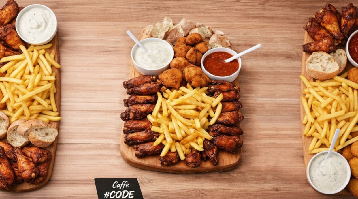 2kg krilaca, 700gr pomfrita, 600gr chicken nuggets-a, somun, ljuti i beli sos + 4 slatke palačinke