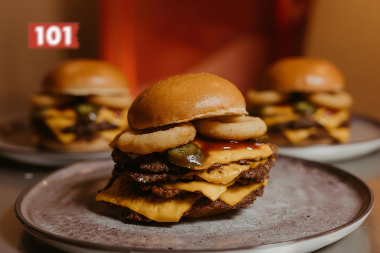 3x 100% juneće meso, sveža zemička, 3x topljeni cheddar, ajsberg, onion rings, BBQ sos, jalapeno papričice