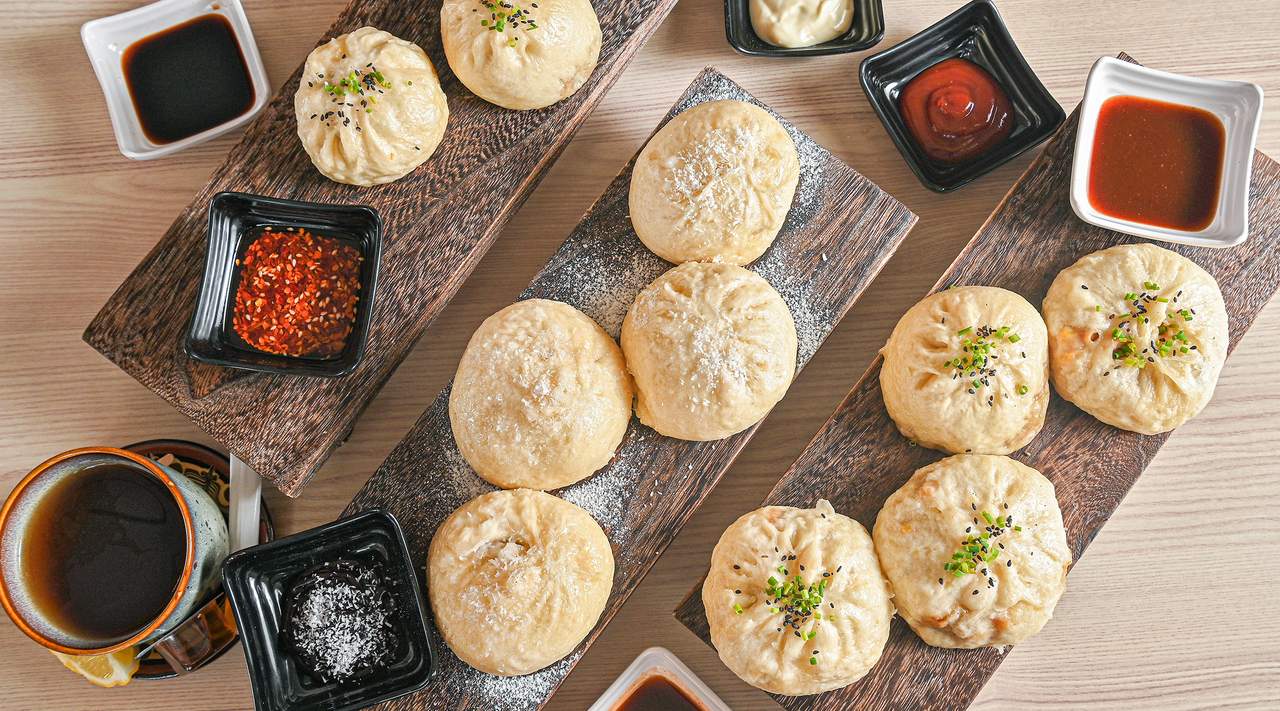 Knedle punjene povrćem, spremane na pari. Kupus, šampinjoni, šargarepa, crni i beli luk, đumbir, sos po izboru