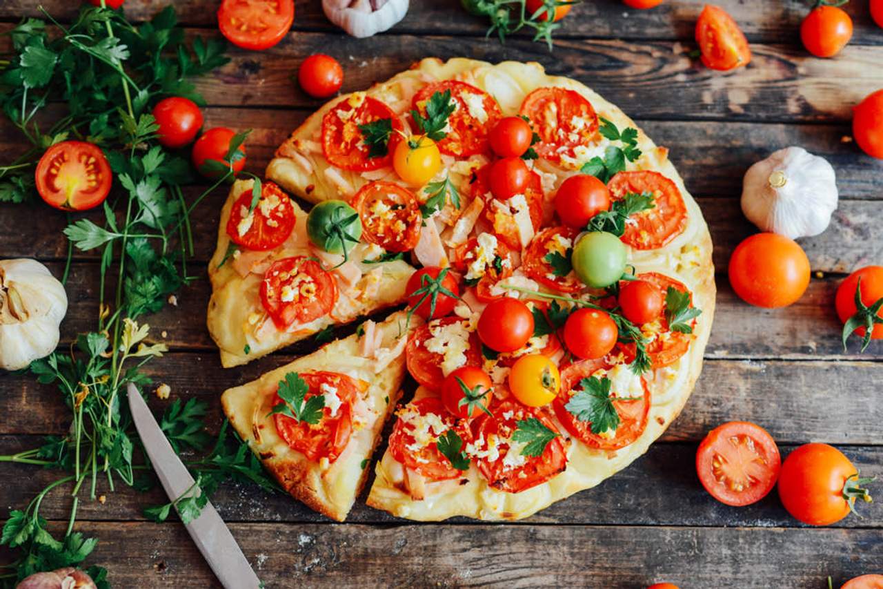 Šampinjoni, kukuruz, biljni sir, paprika, kečap, paradajz, masline