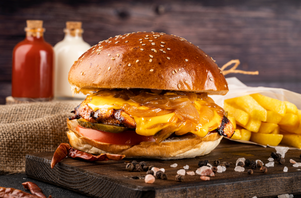 Potato bun, 2x juneće meso, 2x cheddar sir, karamelizovani luk, prženi luk i bbq sos