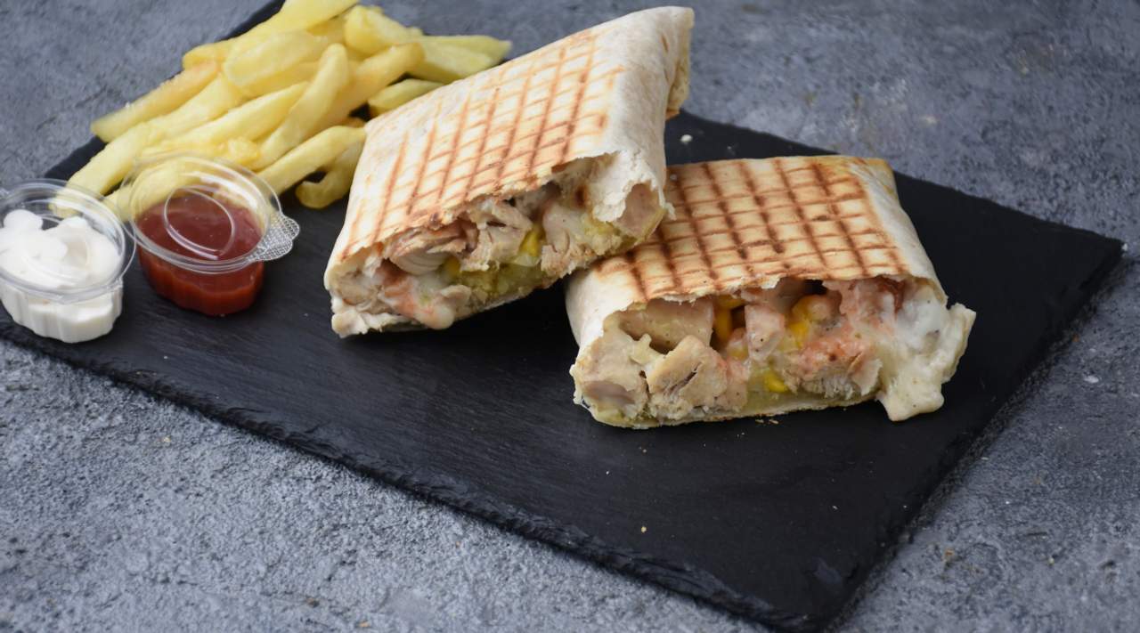 Harissa, Mayonnaise, Salade méchouia, Laitues, Tomates, Olives, Escalope Panée, Frites