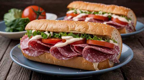 Harissa, salade machoui, mayonnaise, tomate, oignon, laitue, salami