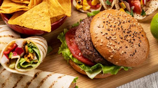 Sauce cocktail, laitue, oignon caramélisée, sauce cheddar, poivron grillée, mixte poulet viande