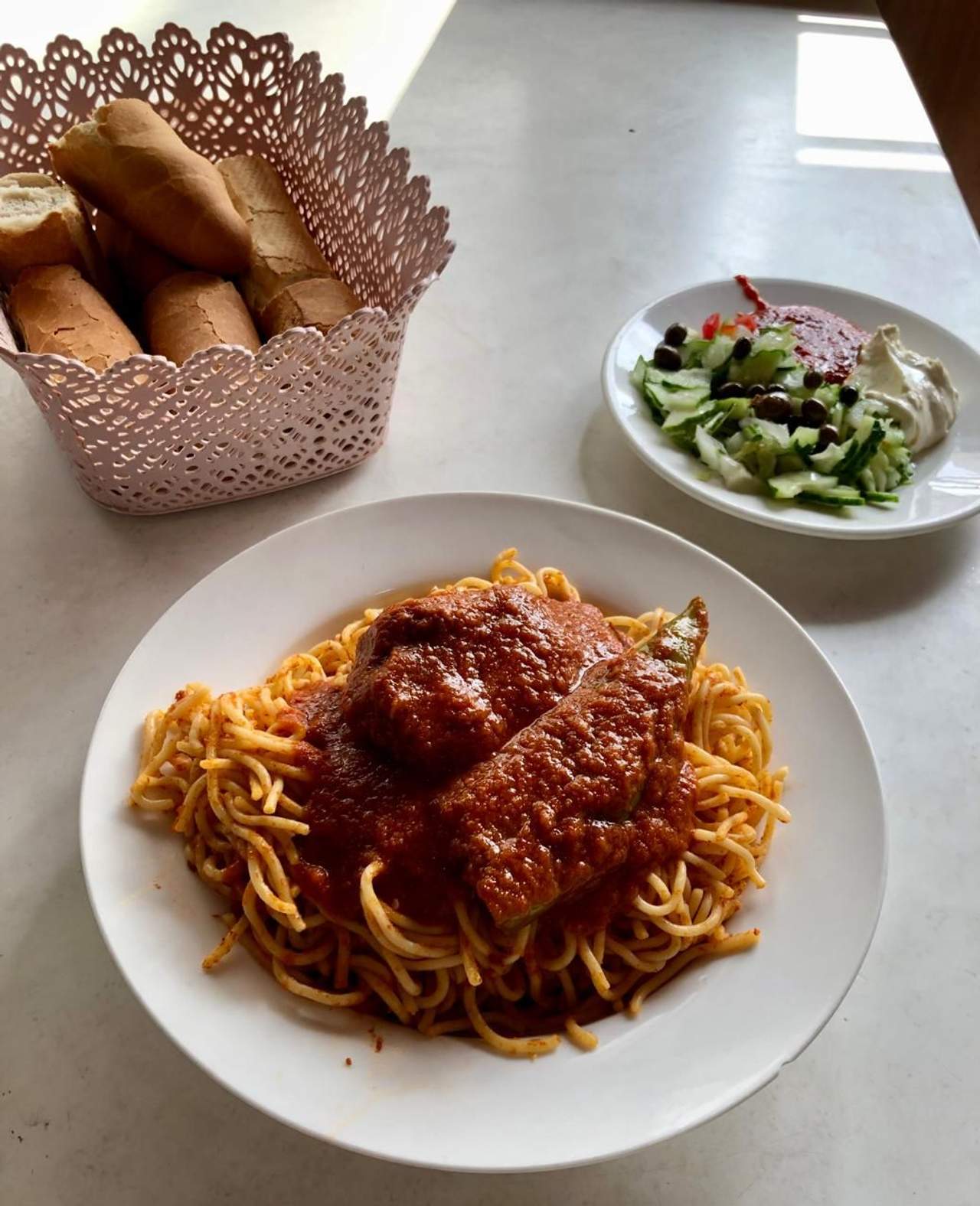 Harissa, salade mechouia, salade tunisienne, oignon, tomate, frites (Baguette ou Tabouna)