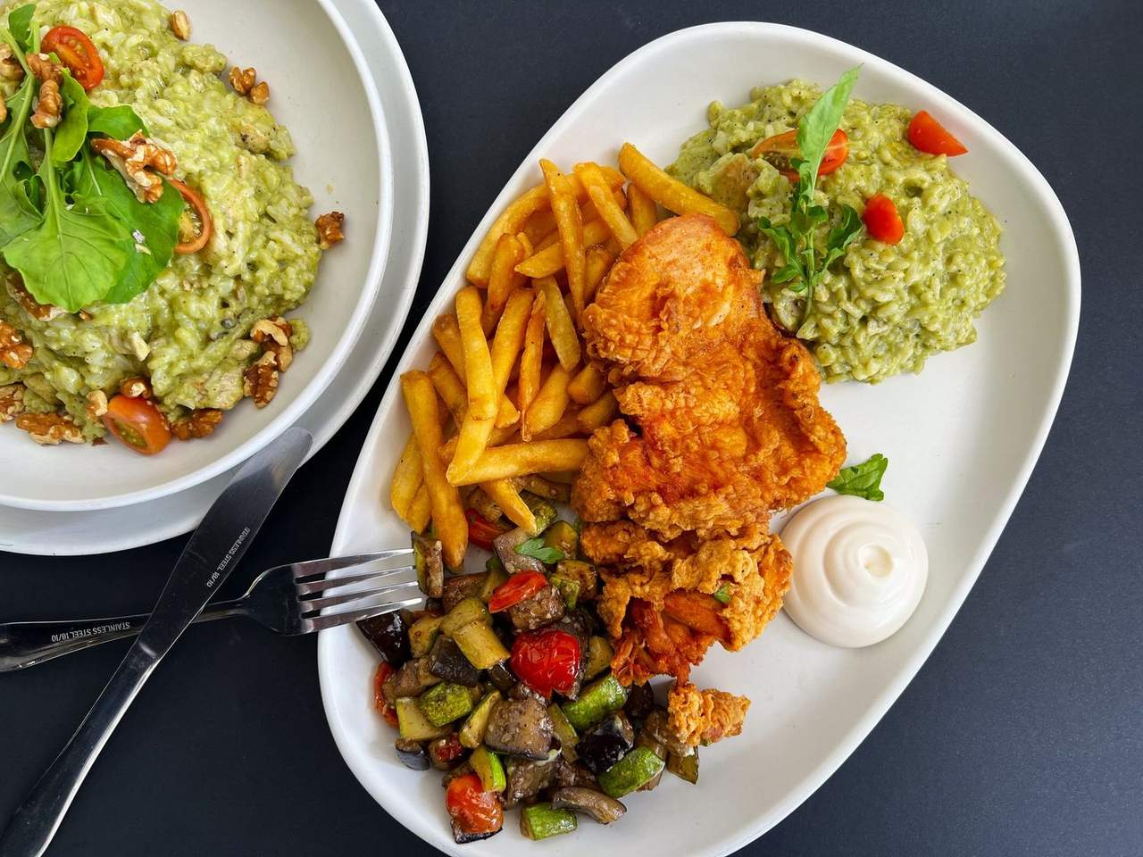 Purée ou risotto ou spaghetti, sauce rouge, légumes sautés, sauce truffe, sauce tartare, sauce à l'ail