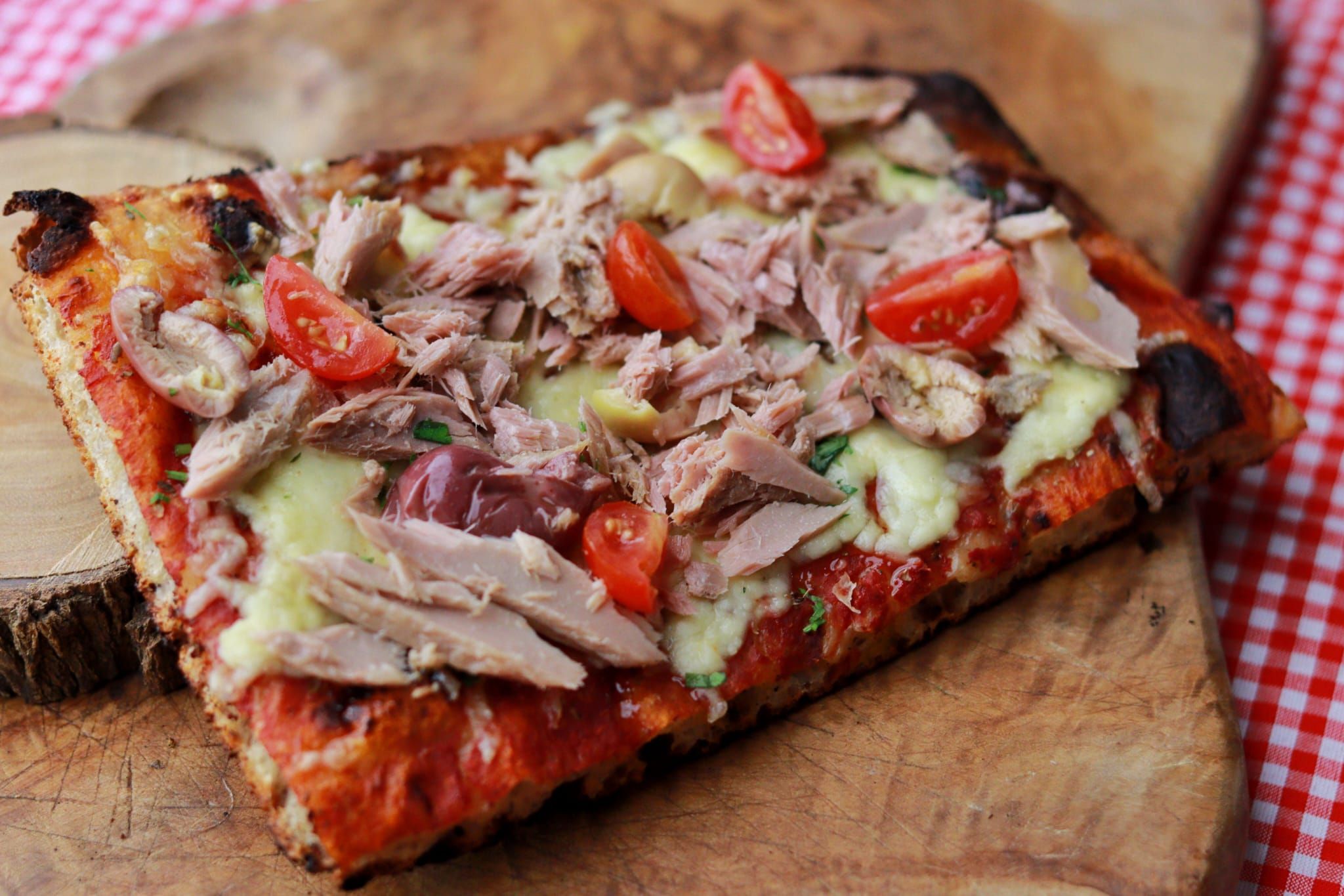 Sauce tomate Origan, mozzarella, olives, Tomates cerises, persil. Thon
