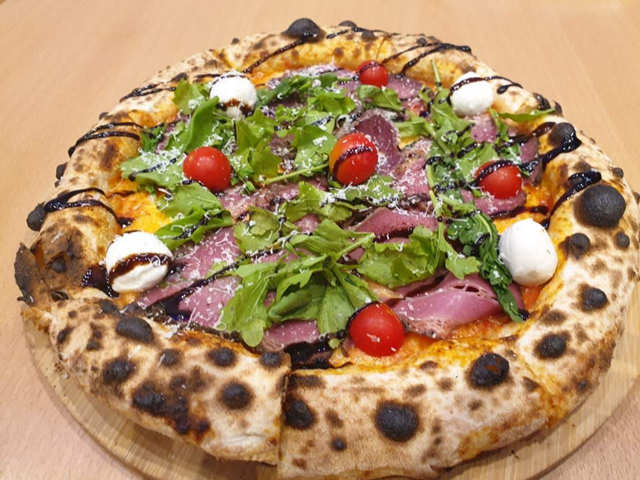 Sauce tomate,mozzarella, oignons,olives,escalope de poulet,basilic frais