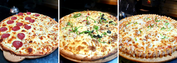 Sauce maison, olives, jambon de bœuf, pepperoni, champignons, poivrons, oignons, mozzarella