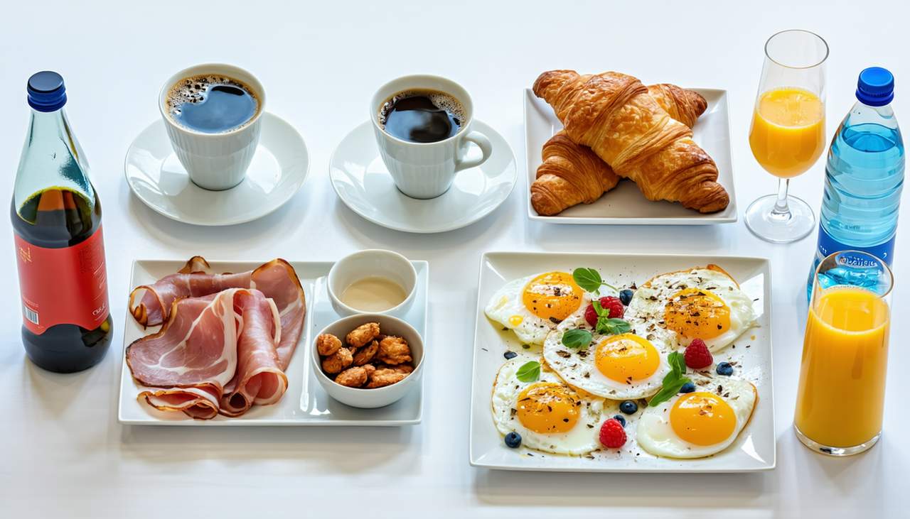 Café, viennoiserie, œuf, bouteille d'eau, jus de saison