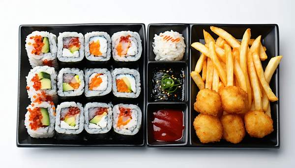 Роли: • SaLmon Фрі — запечений лосось, огірок, чука, ікра тобіко, загорнутий у хрумку темпуру й политий соусом Унагі• Запечений рол з креветкою — креветка, крем-сир, огірок, ікра тобіко під ніжною сирною шапочкою• XL "Black crispy" смажений з тунцем — тунець, вершковий крем-сир, свіжий огірок, ікра тобіко, загорнутий у норі з чорнилом каракатиці й панірований у темпурі та панкоСоєвий соус - 3 штІмбир - 2 штВасабі - 2 шт