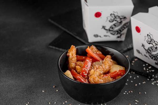 Куряче філе, Болгарський перець, ананас консервований, Кисло-Солодкий соус, кунжут