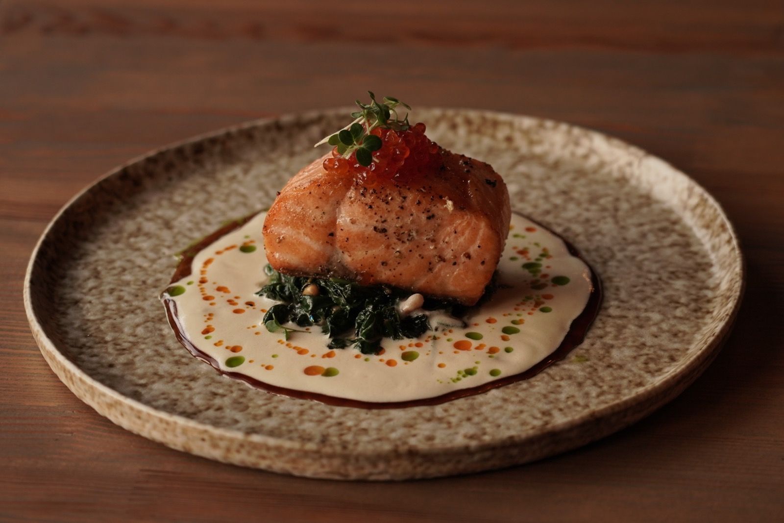 Ніжне філе дорадо зі шпинатом і зеленим горошком, томати чері, пюре з картоплі з водоростями норі та хрумкий рисовий чіпс. Завершує страву ароматна паприкова й зелена олія.