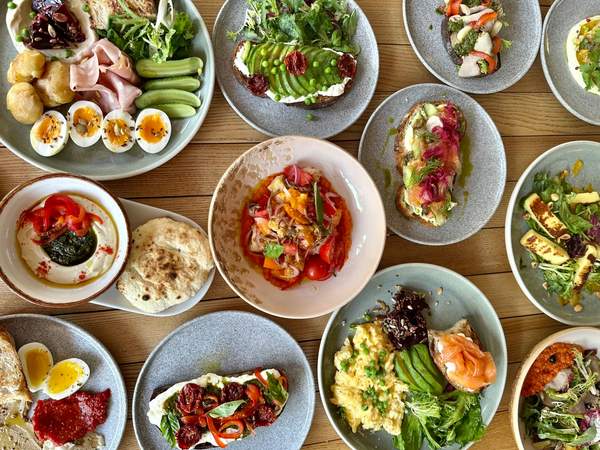 Мікс зелені, трюфельна страчателла, хамон, базилік, фундук, томати конфі.