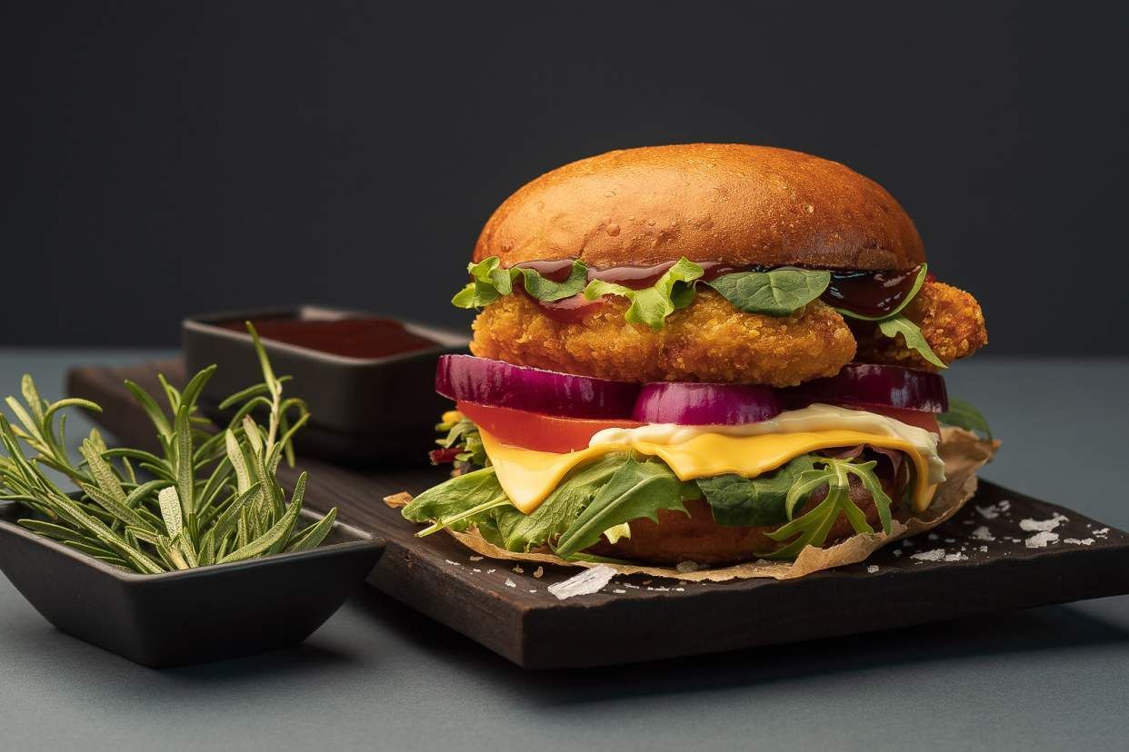 280г Булочка для бургера, філе курчати-бройлера в паніровці, сир "Чеддер", помідор, перець конфі, айсберг, огірок маринований, соус барбекю з димом, масло вершкове, гірчиця "Американська".100г:209,90 ккал/Б9,47/Ж9,13/В21,86