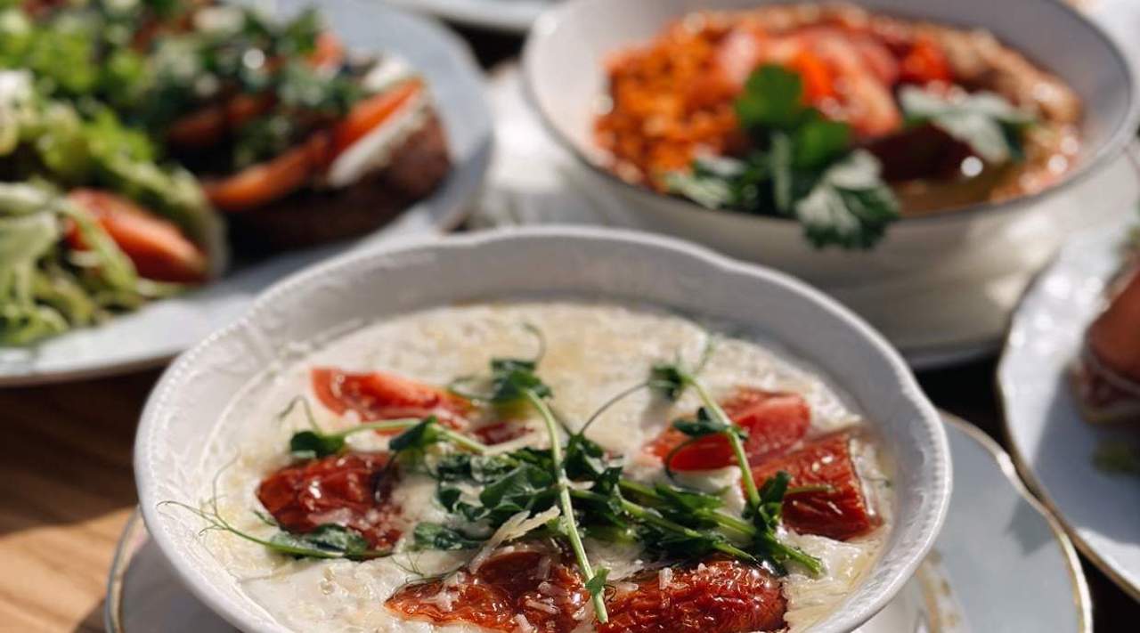 Солона вершкова вівсяна каша. Подається зі свіжими та вʼяленими томатами, пармезаном та трюфельною олією