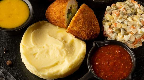 Пюре, салат крабовий, куряче стегно (без кістки)