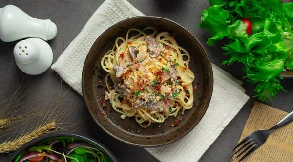 Тальятеле, бекон, вершки, сир Пармезан, яйце, прованські трави