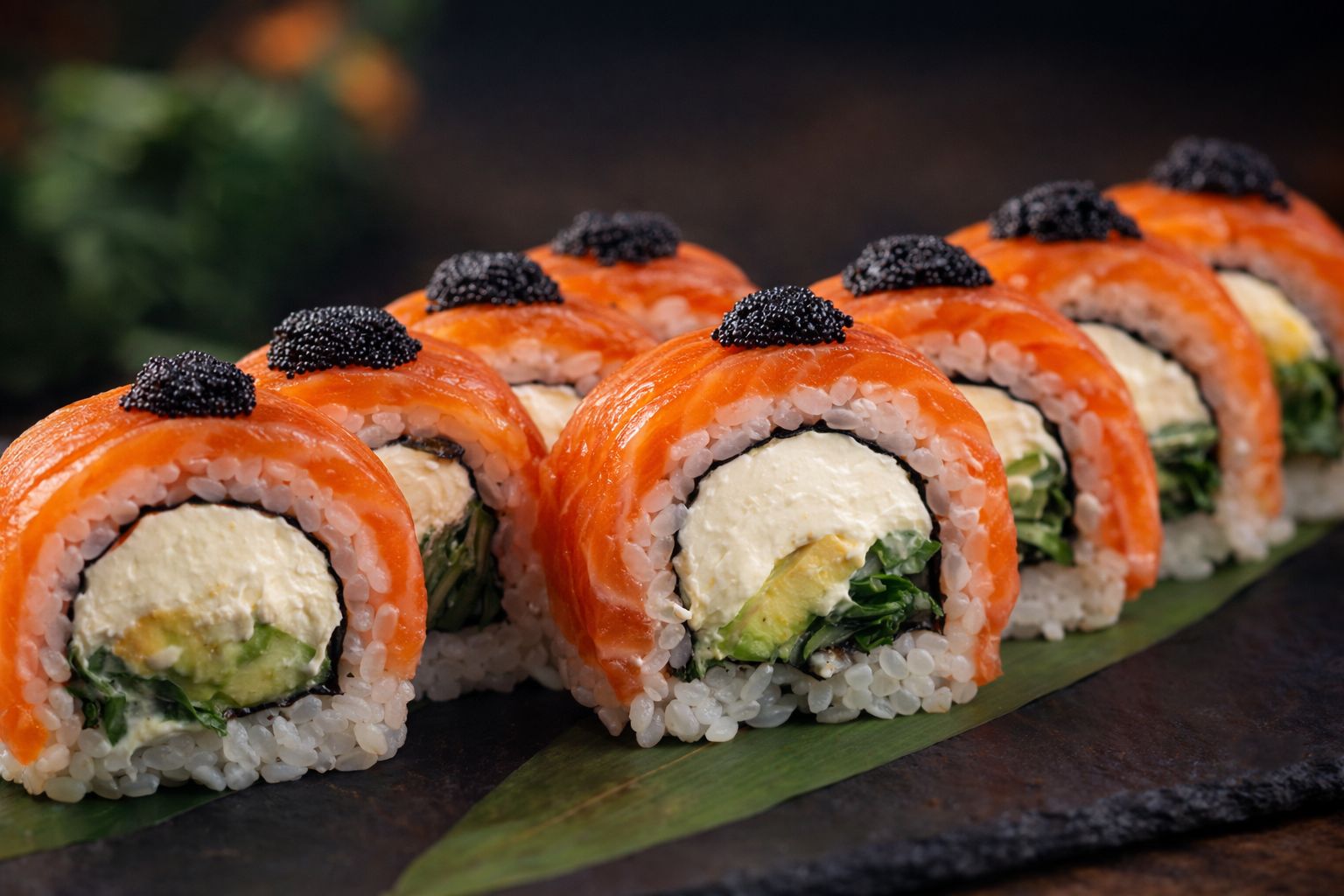 Рис, норі, слабосолоний лосось, сир "Філадельфія", сир "Дор Блю", сир "Пармезан", помідор, салат "Лолло Біонда", соус "Теріякі", панко, темпура,чілі павутинка