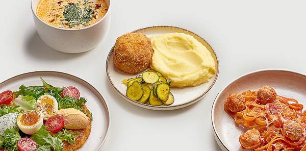 370г Курячі мітболи у вершковому соусі, 140 г Картопляне пюре, 180 г Подаємо із лінивими огірочками, 50 г